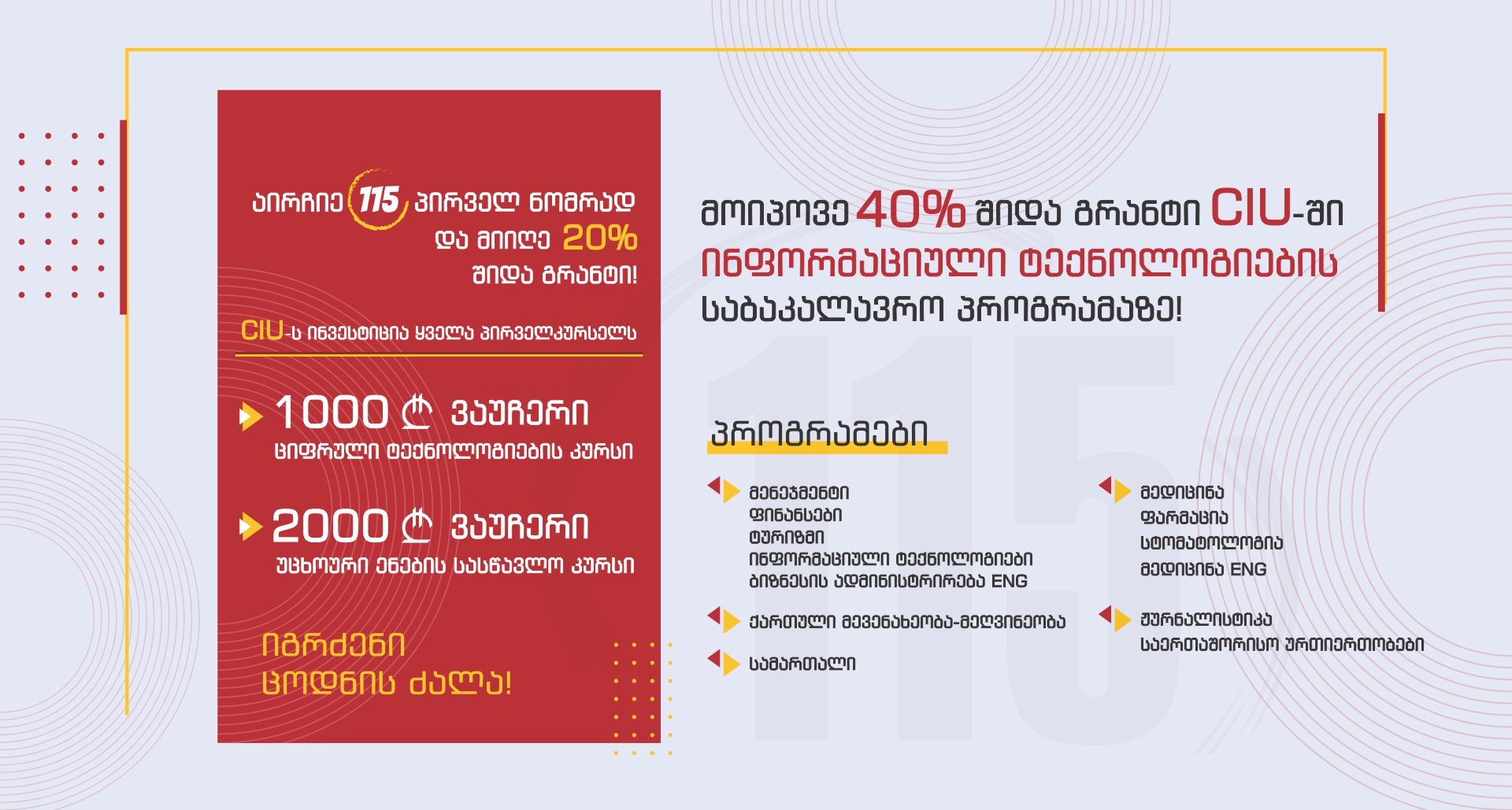 აირჩიე CIU-ს ინფორმაციული ტექნოლოგიების საბაკალავრო პროგრამა და მოიპოვე 40%-იანი შიდა გრანტი. შეავსე სარეგისტრაციო ბმული და მოითხოვე 40% გრანტი.